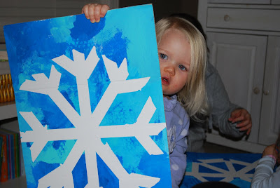 We also painted some super easy snowflakes that turned out oh-so-cute! First we started by taping snowflake shapes onto white cardboard using painter's tape.